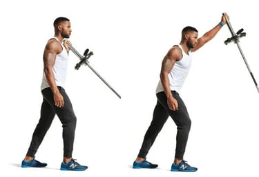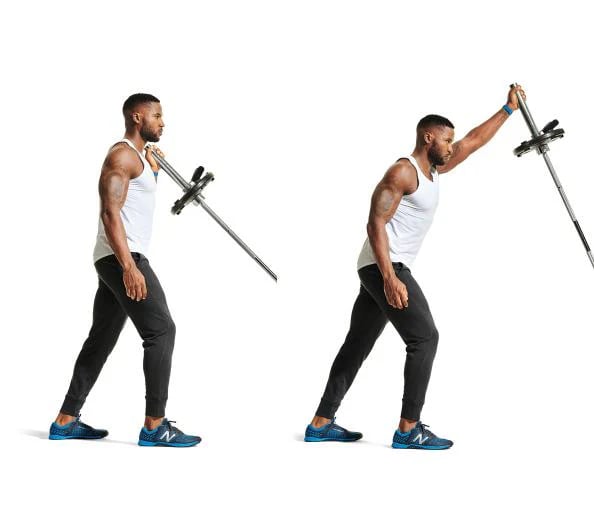 The classic pressing movement performed standing with a barbell. It develops strength in shoulders, triceps, and upper chest while engaging the core for stability and full-body strength improvement.